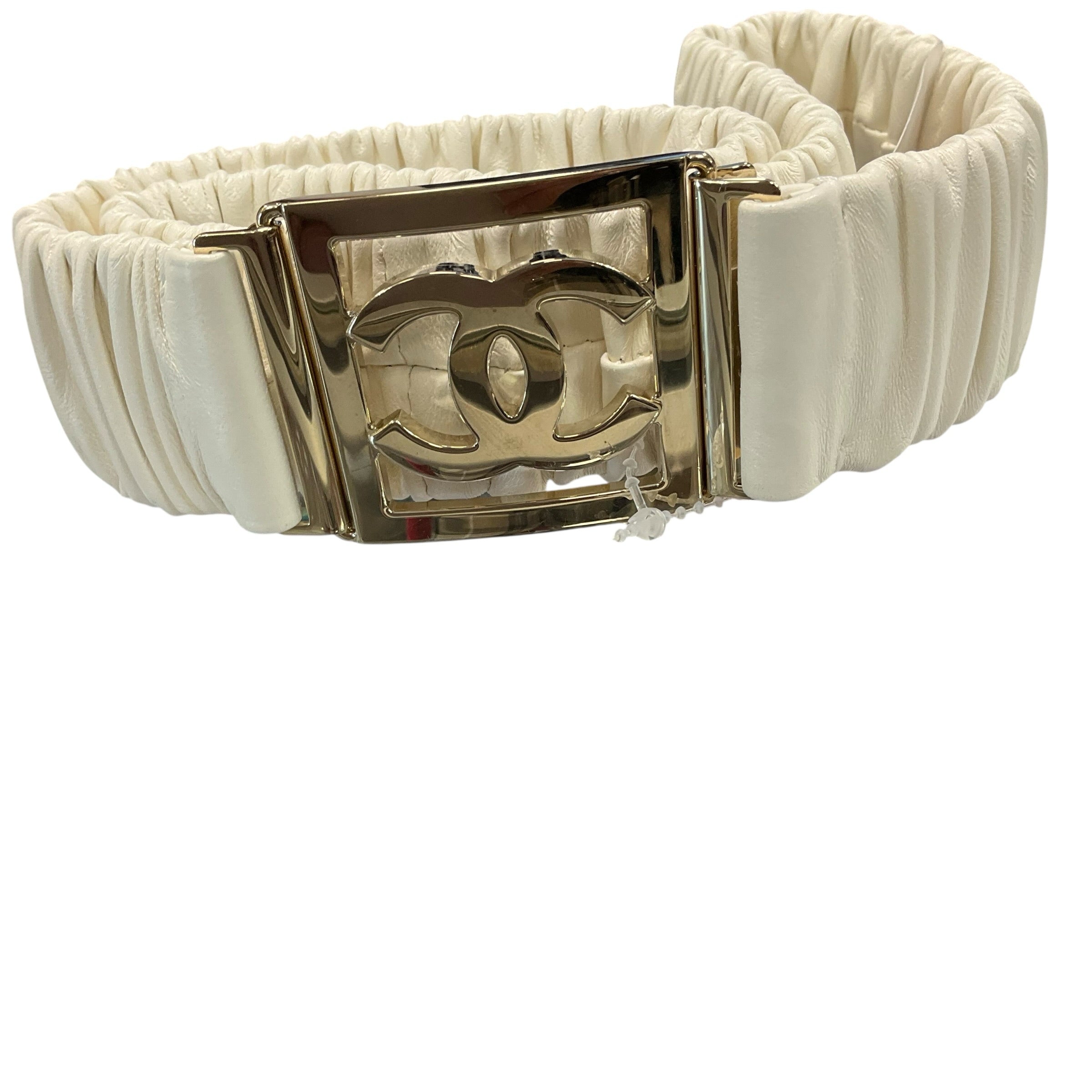 CHANEL Ivory Leather Stretch Belt with Gold Bling Buckle 1 1/2 Inch Size 26"/46". 21476-9557. CHIC AT THE BEACH,Lewes,DE.