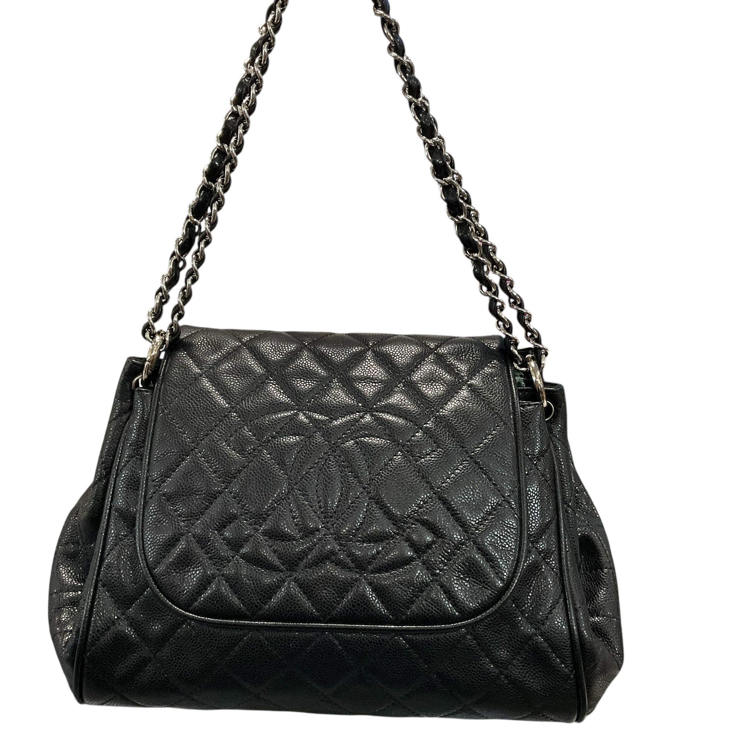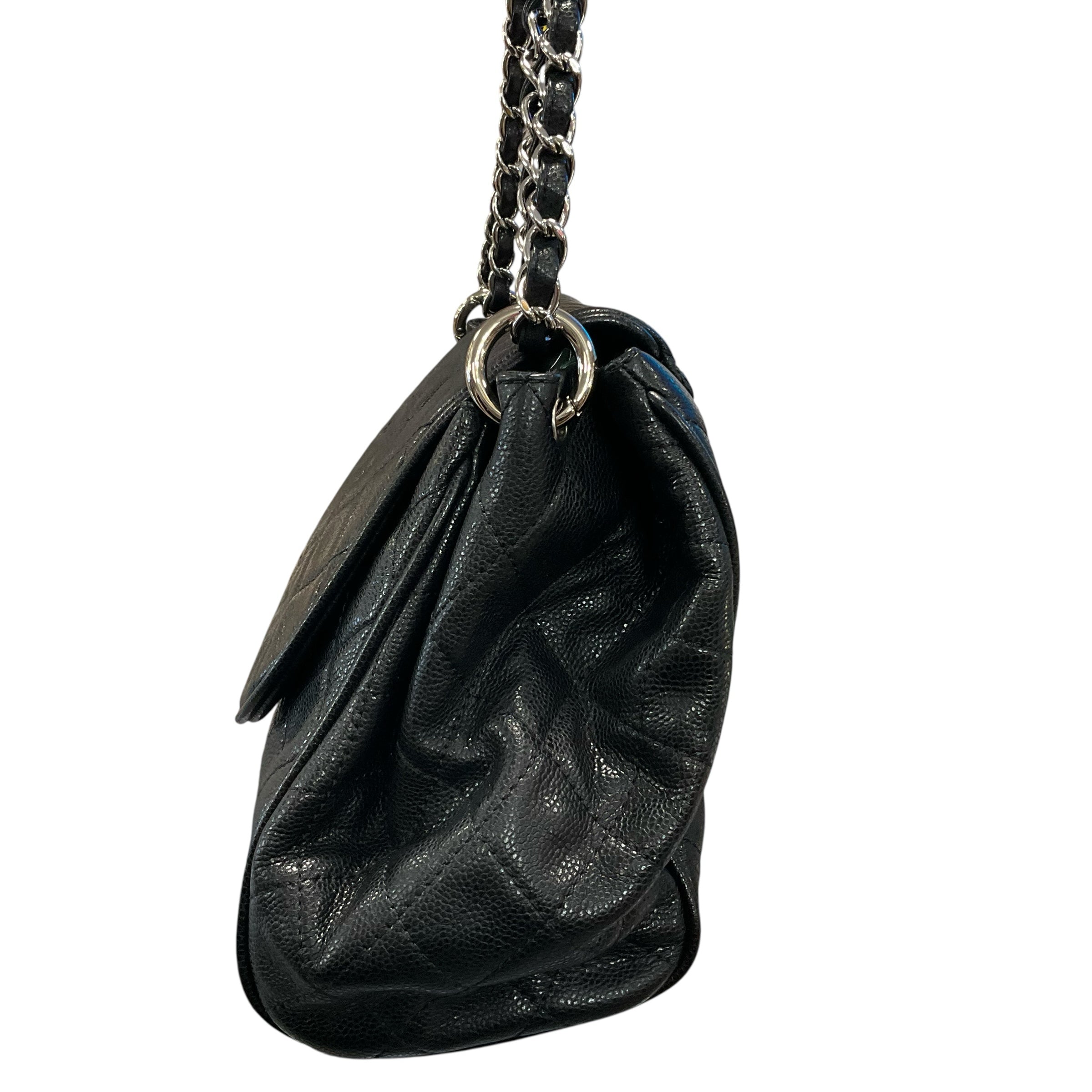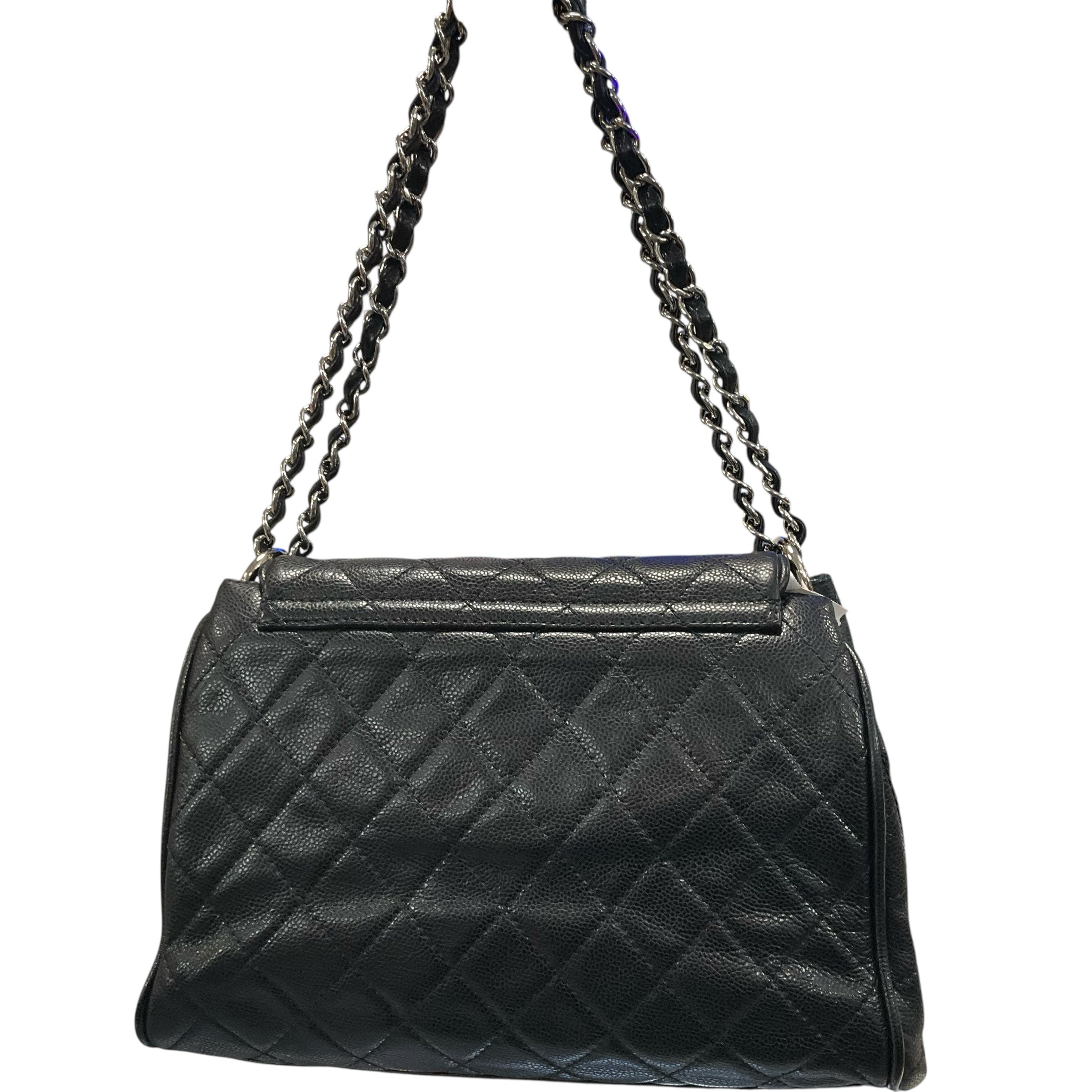 Chanel Black Caviar Leather Flap Silver Chain Bag.29237-69 Measurements: Length 11" Width15" Depth 4.5. CHIC AT THE BEACH,Lewes,DE.19958.