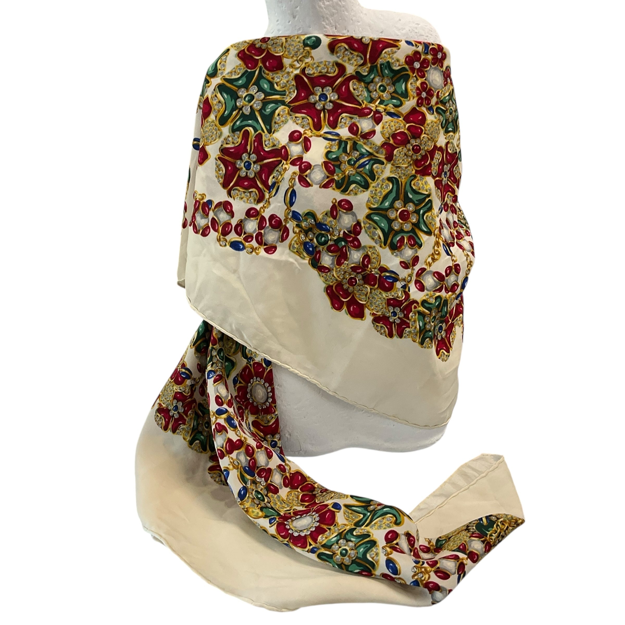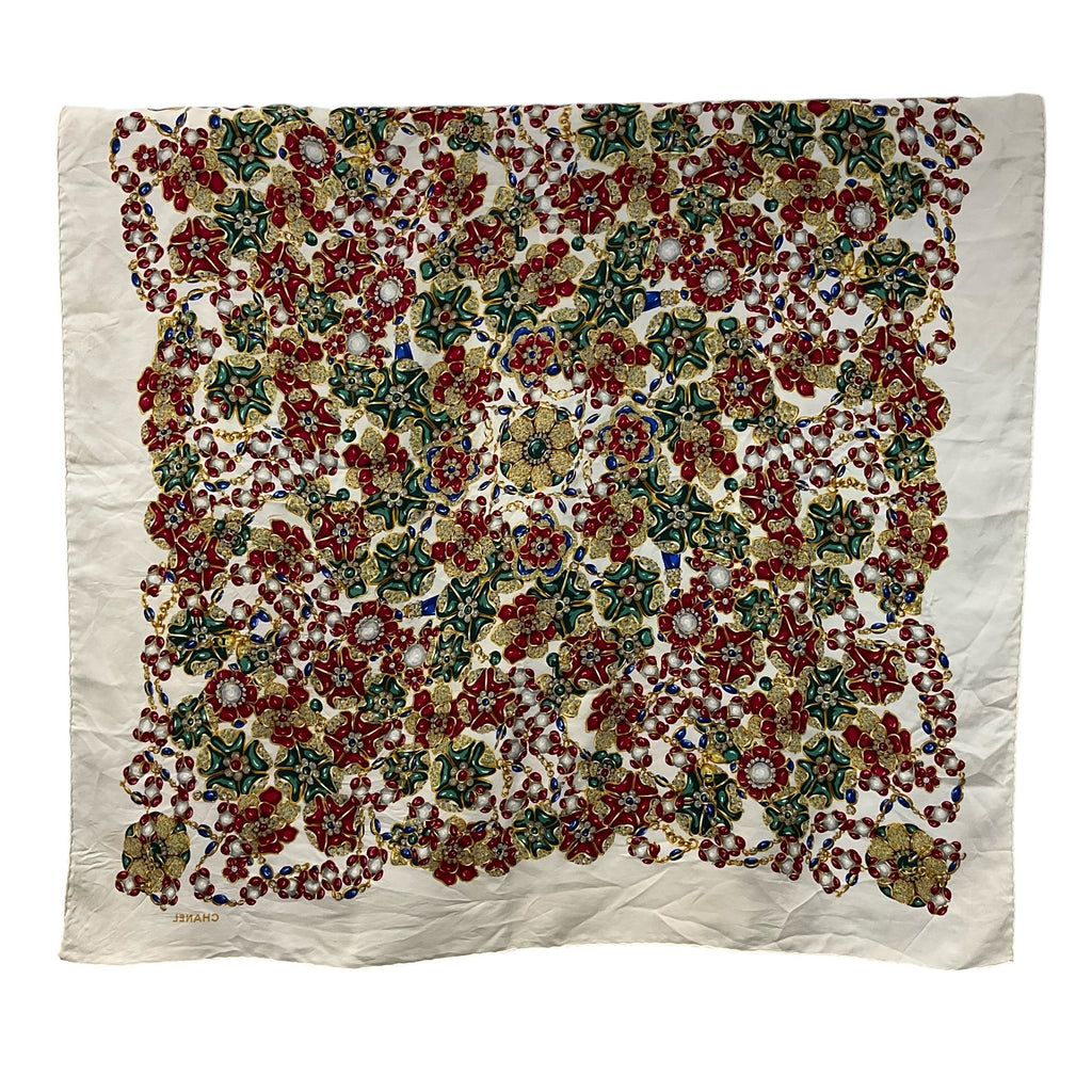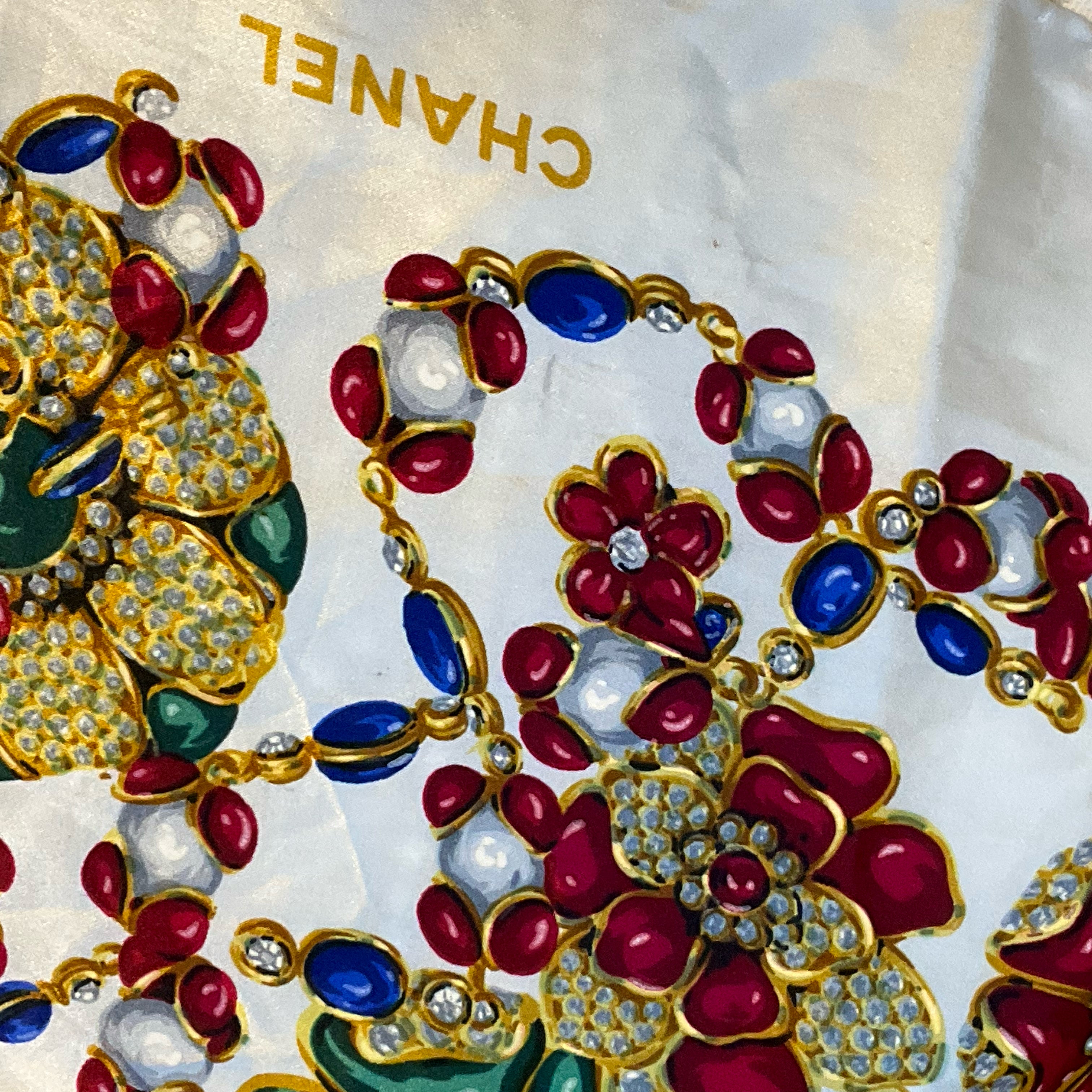 CHANEL SILK FLORAL Scarf RED/GREEN/BLUE FLORAL W JEWELS - multi is backordered and will ship as soon as it is back in stock.