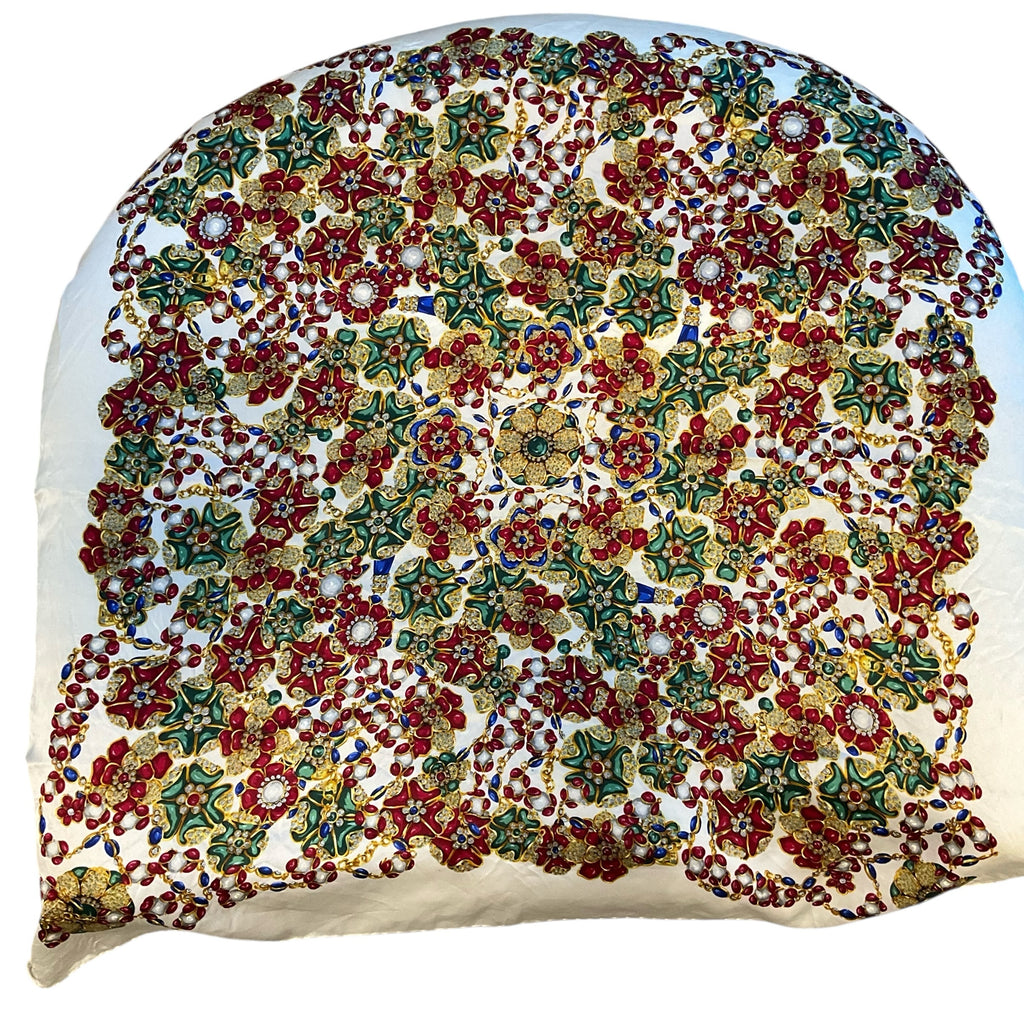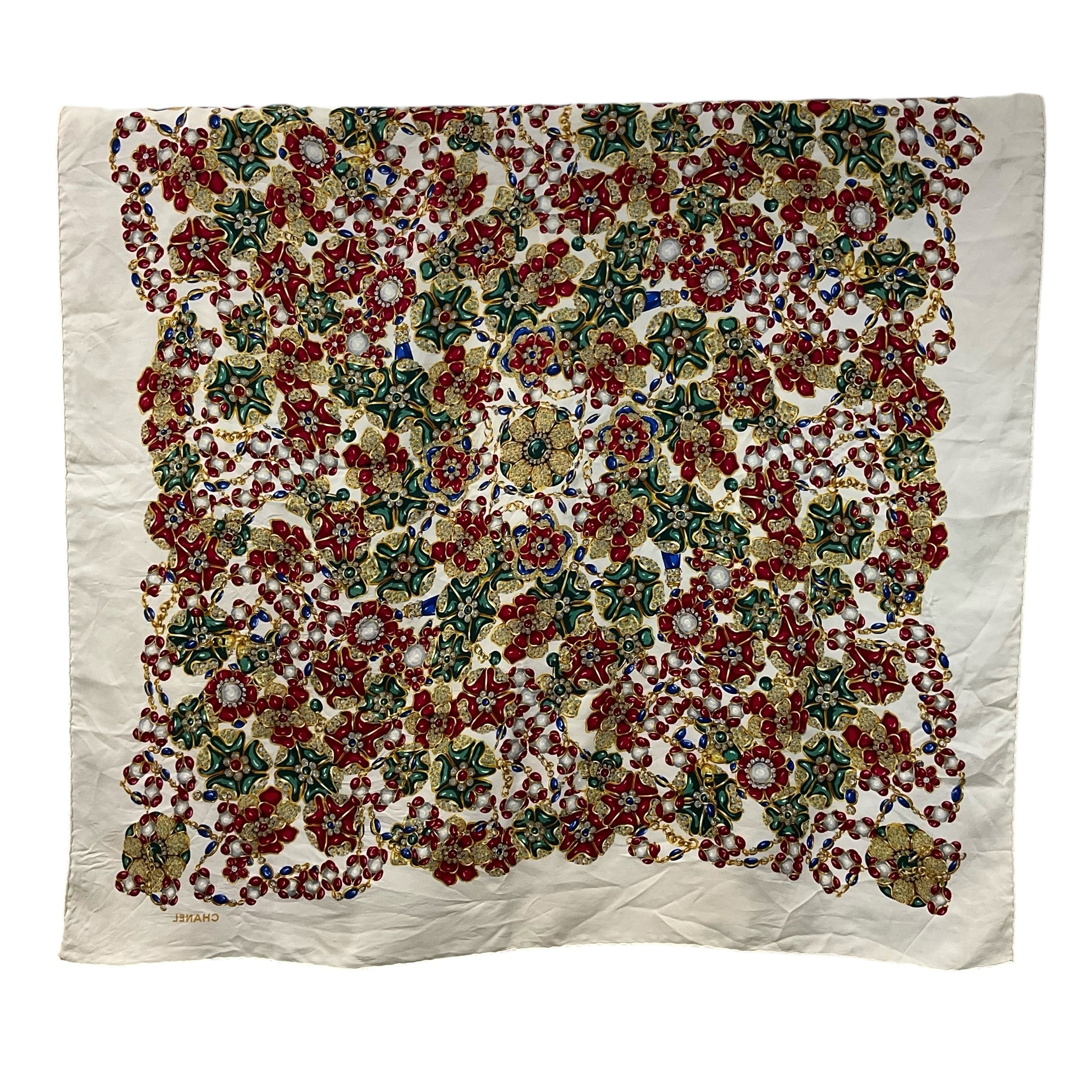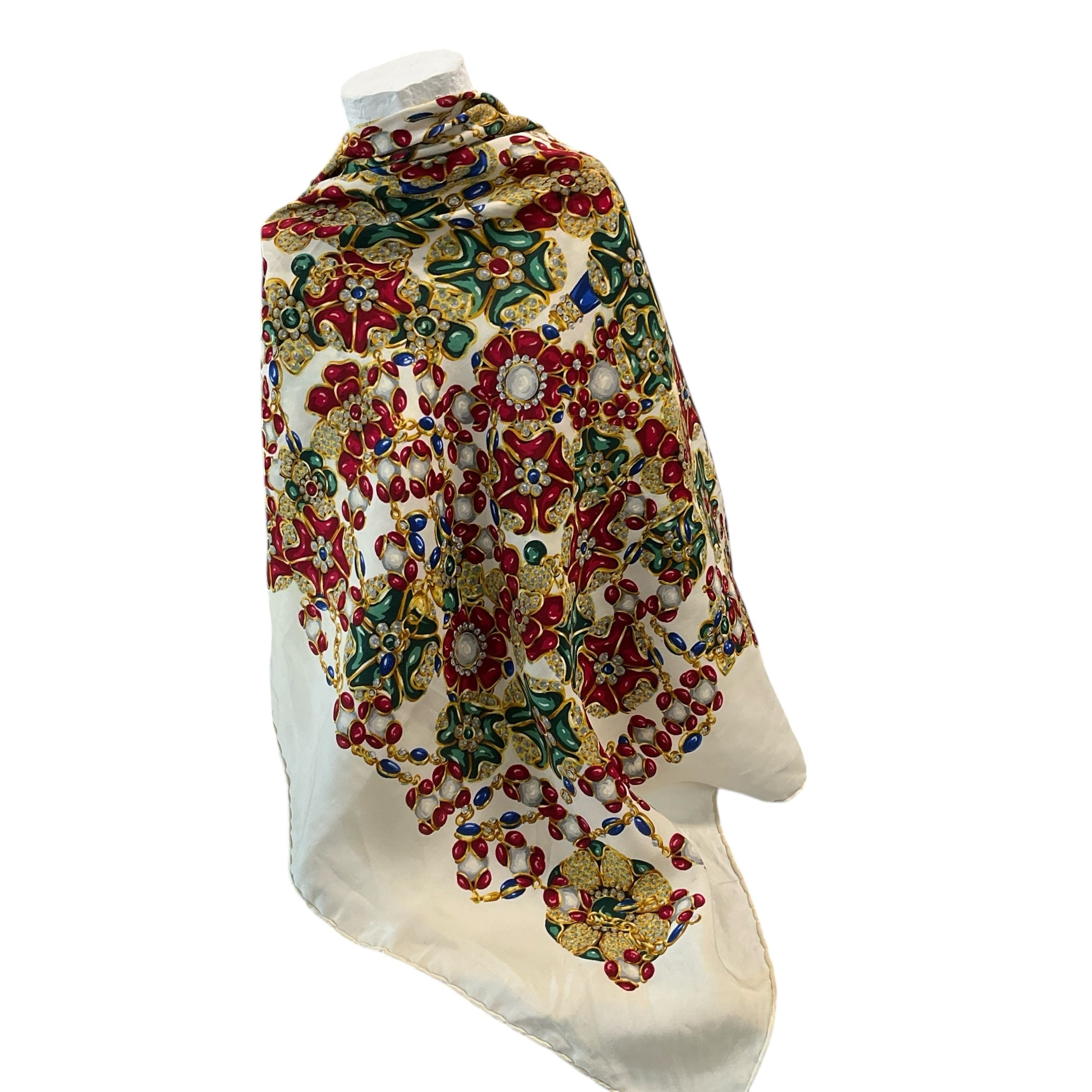 CHANEL SILK FLORAL Scarf RED/GREEN/BLUE FLORAL W JEWELS - multi is backordered and will ship as soon as it is back in stock.