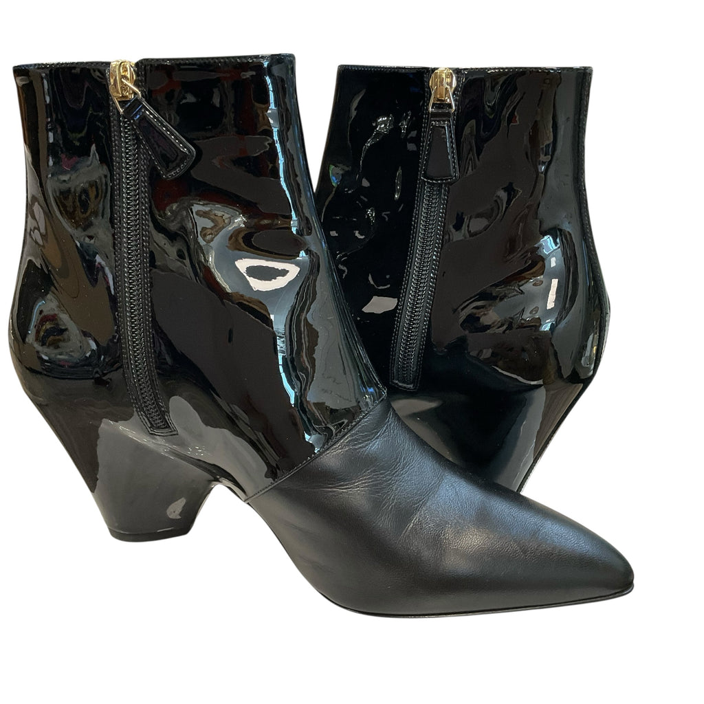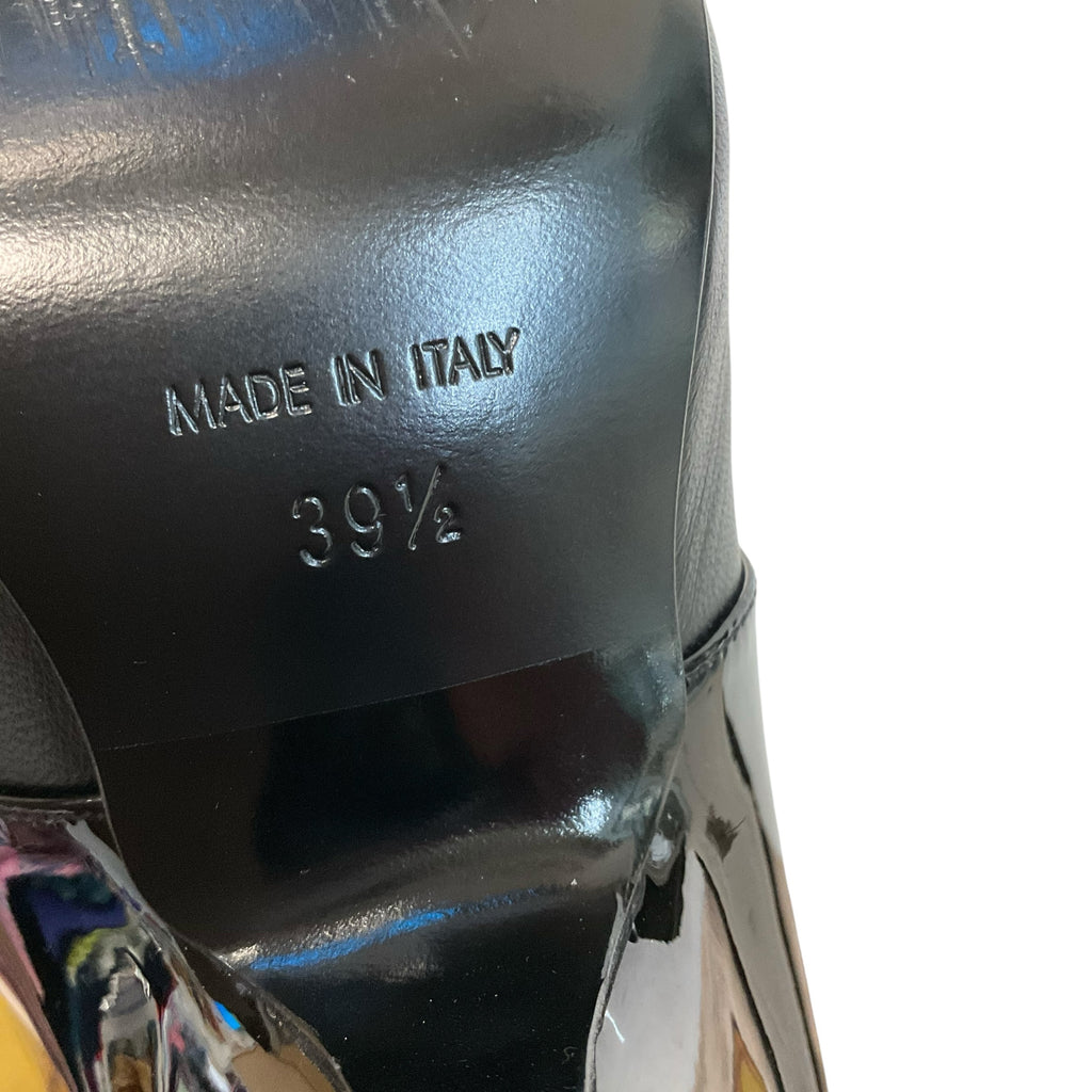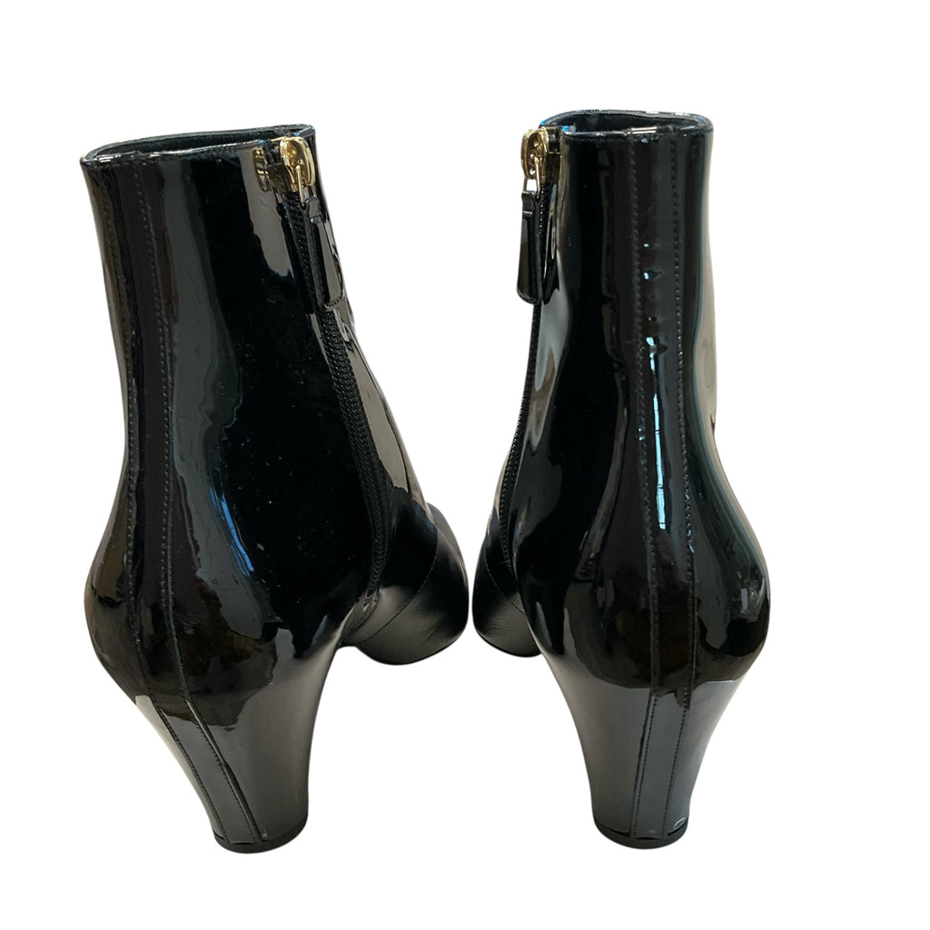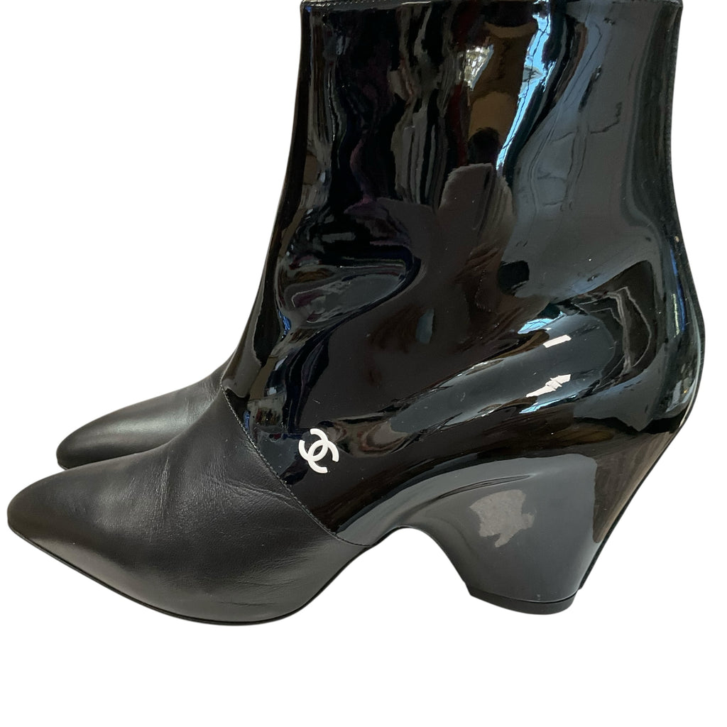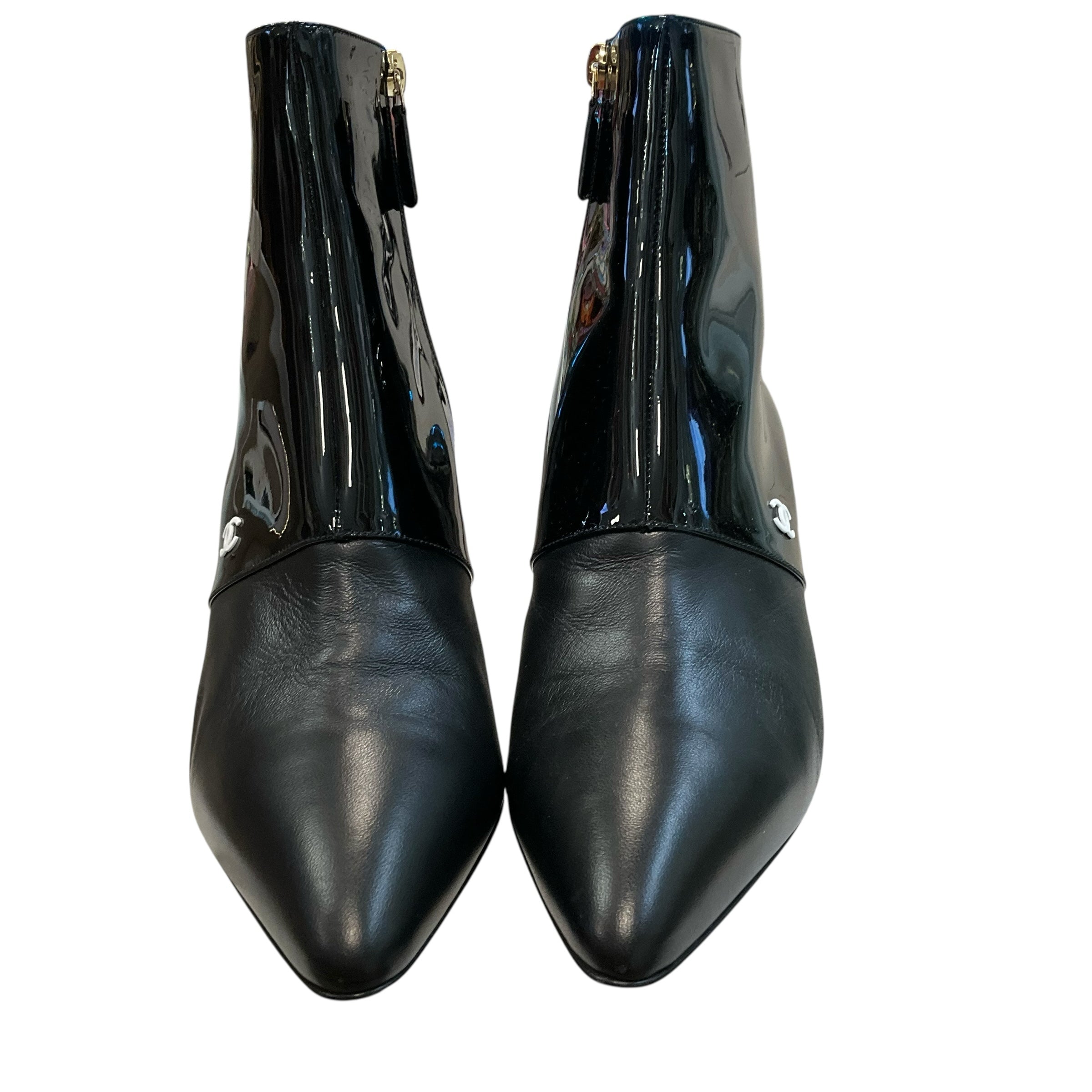 Authentic Chanel Black Patent Leather Bootie Ankle Height with Side Zipper and Side Logo. Size 39.5 European Sizing. With Box and Shoe Bags.CHIC AT THE BEACH,Lewes,DE.19958.
