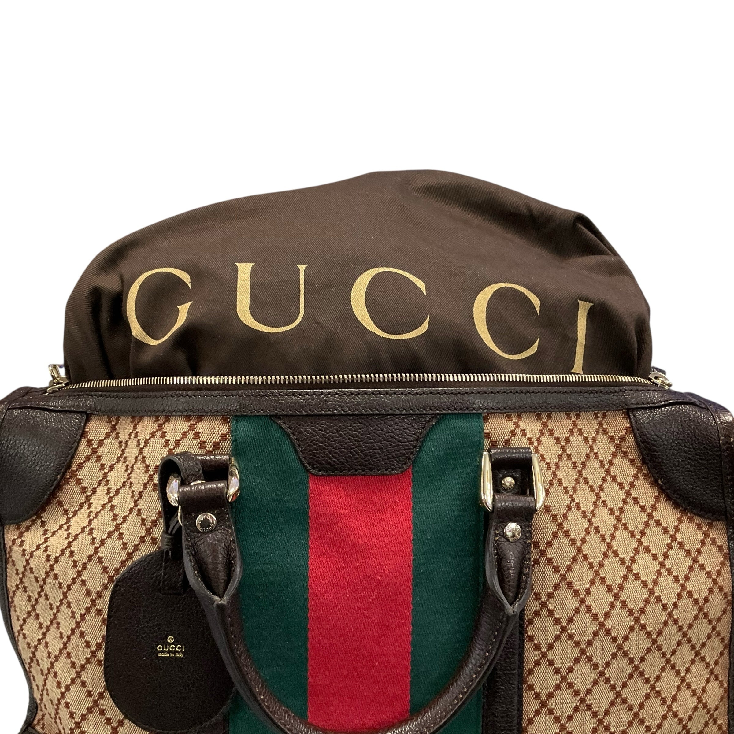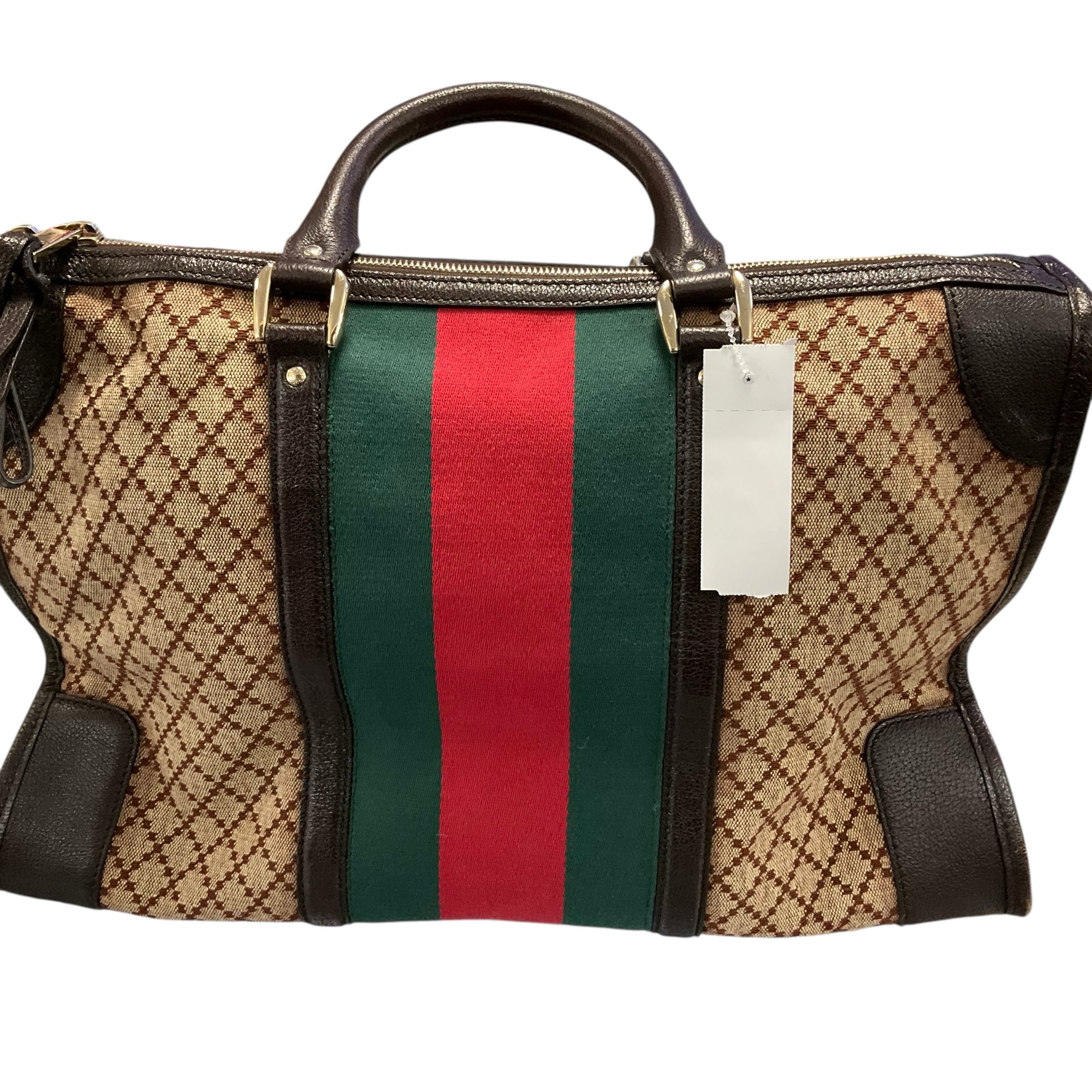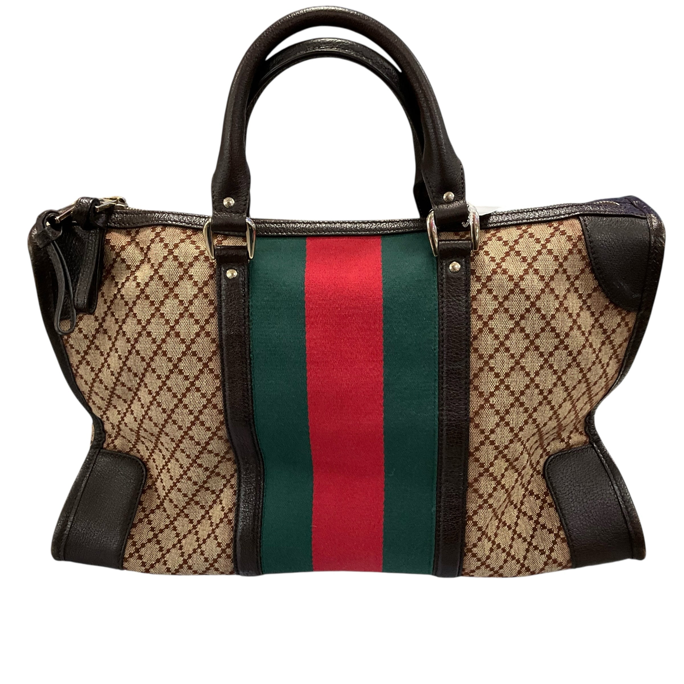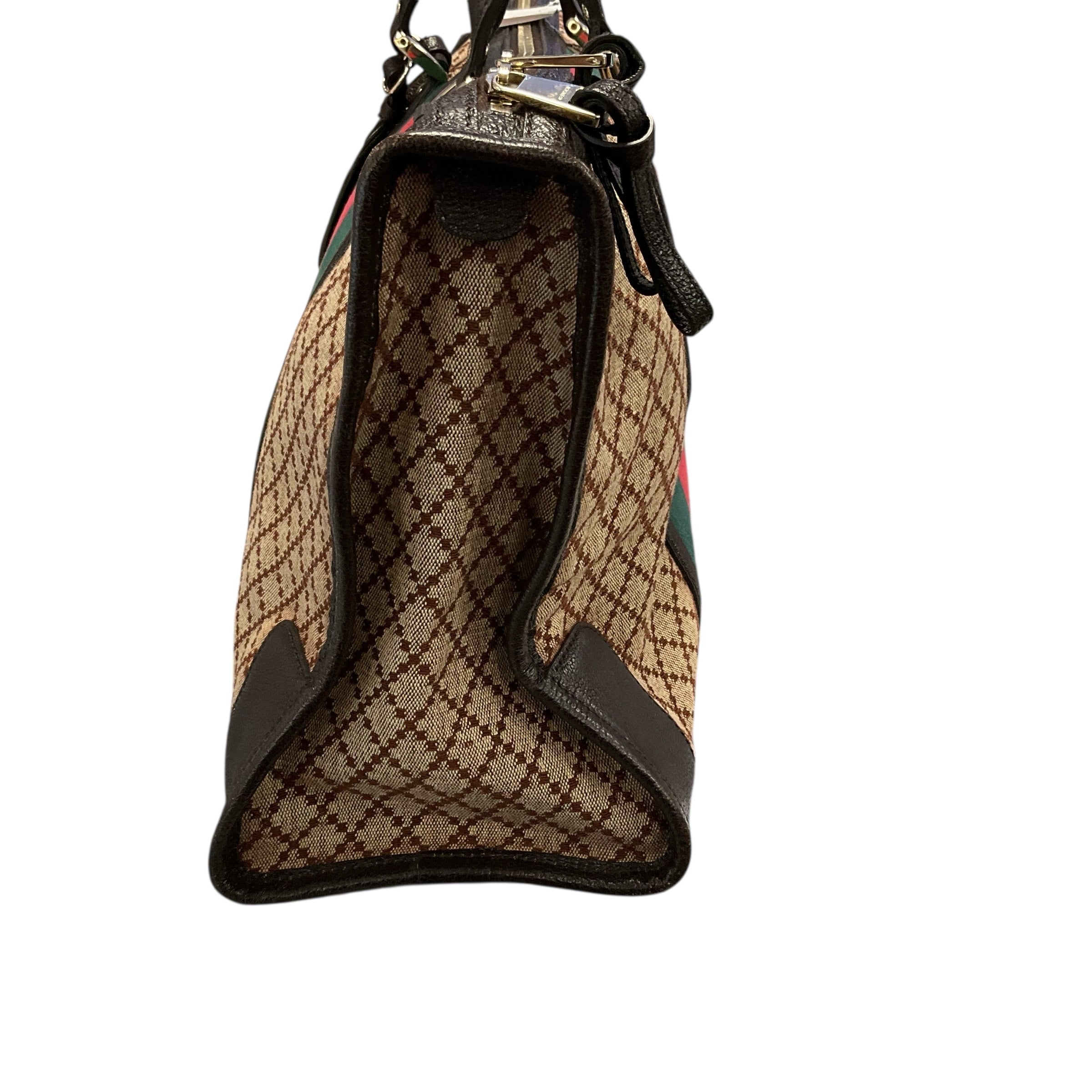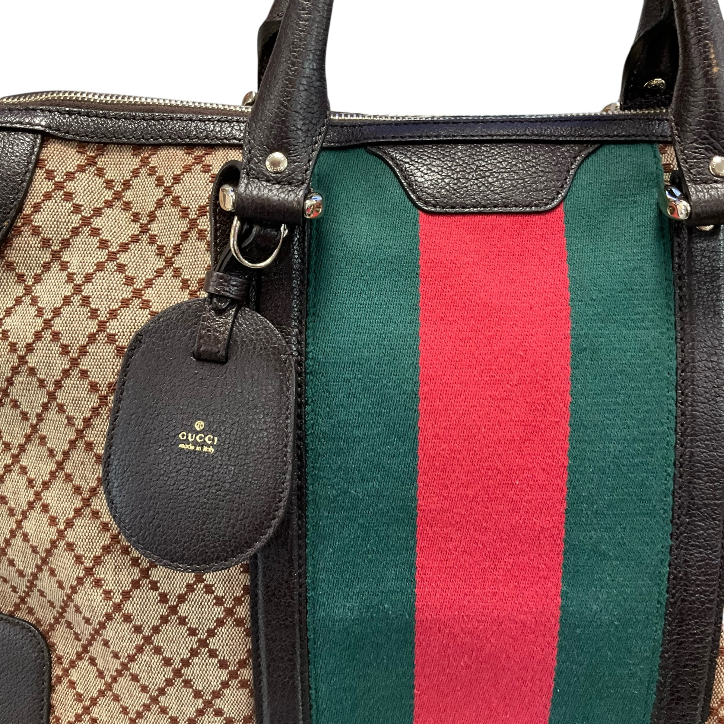Authentic Gucci Large Web Canvas Bag with Leather Trim Supreme Boston. 4.5 Inch Strap Drop. 17W X 12H X 7D. CHIC AT THE BEACH Lewes Delaware.