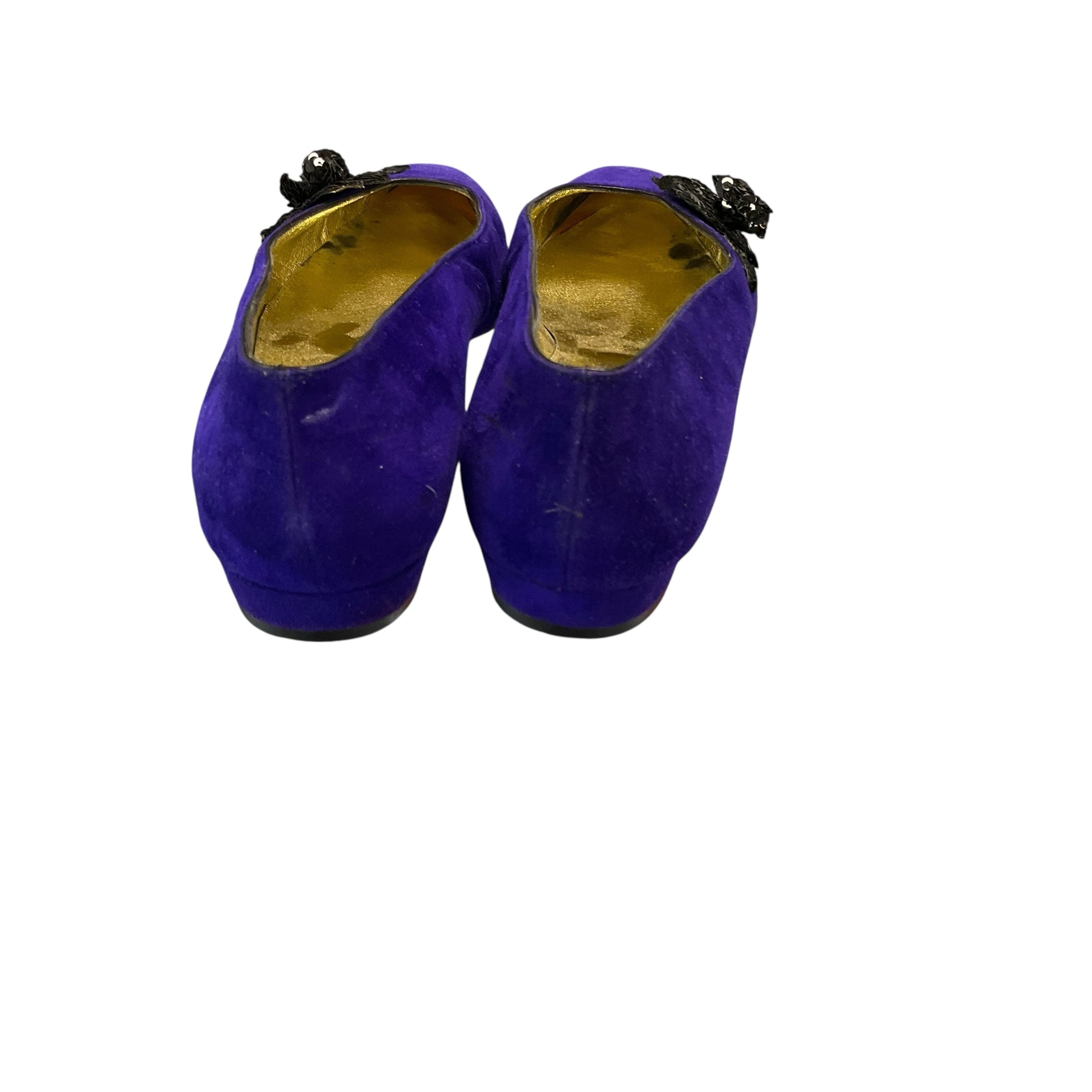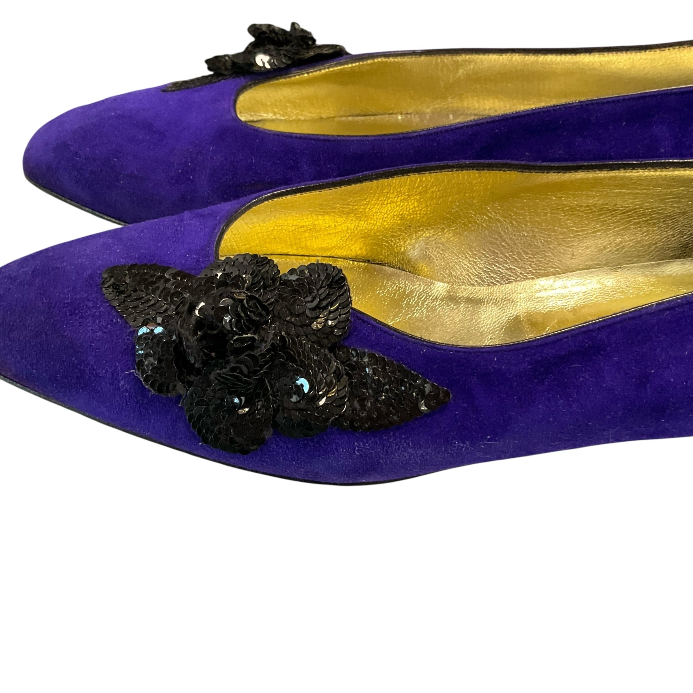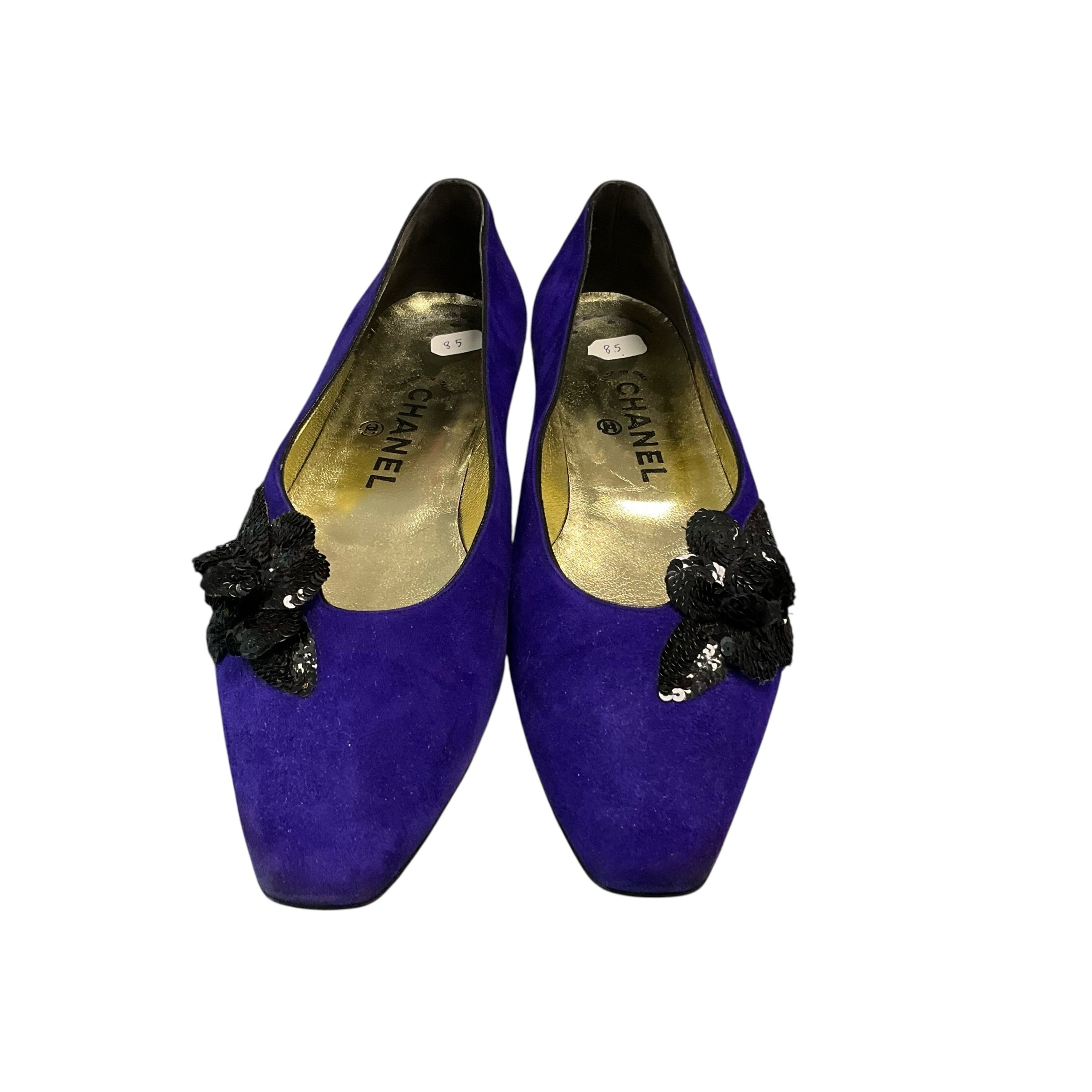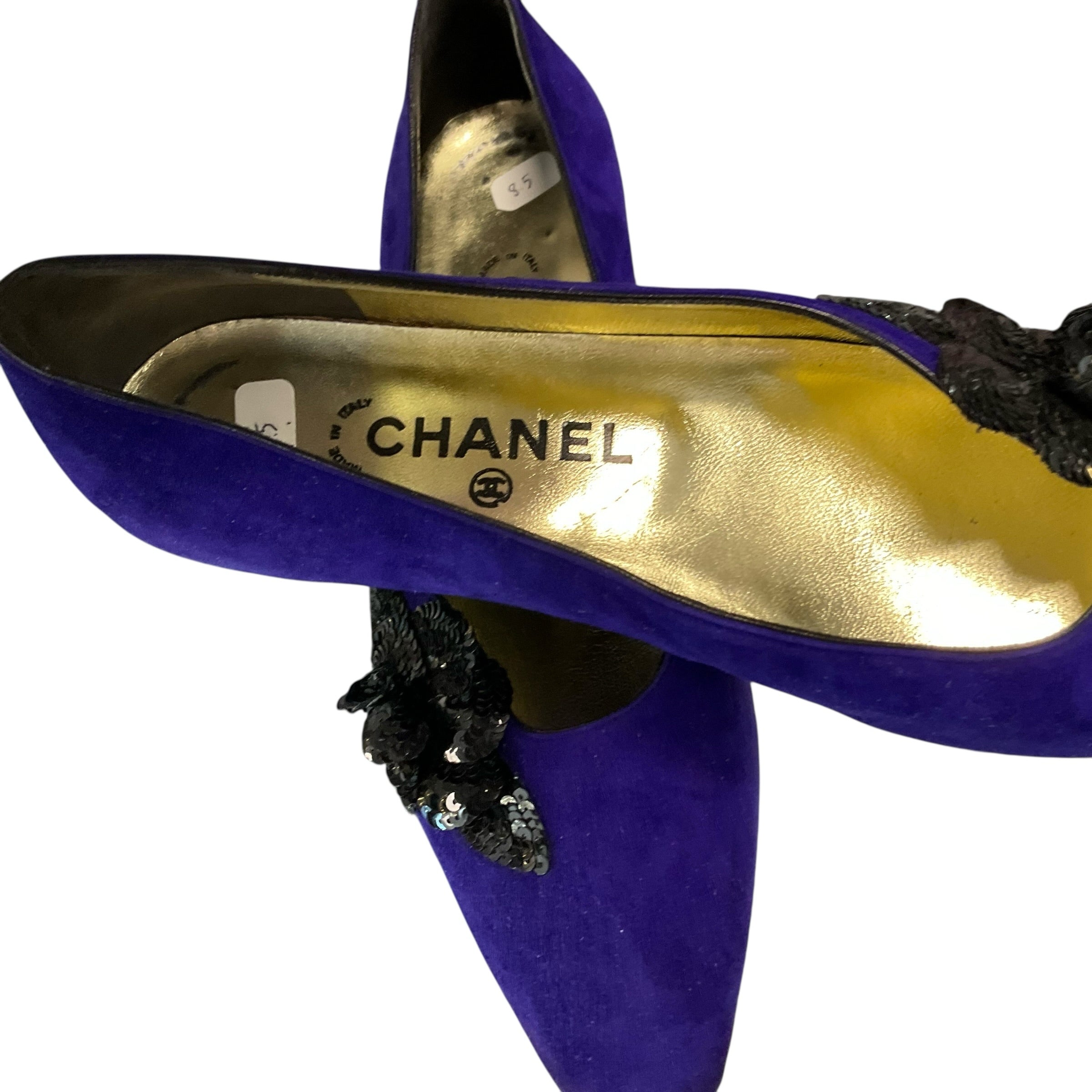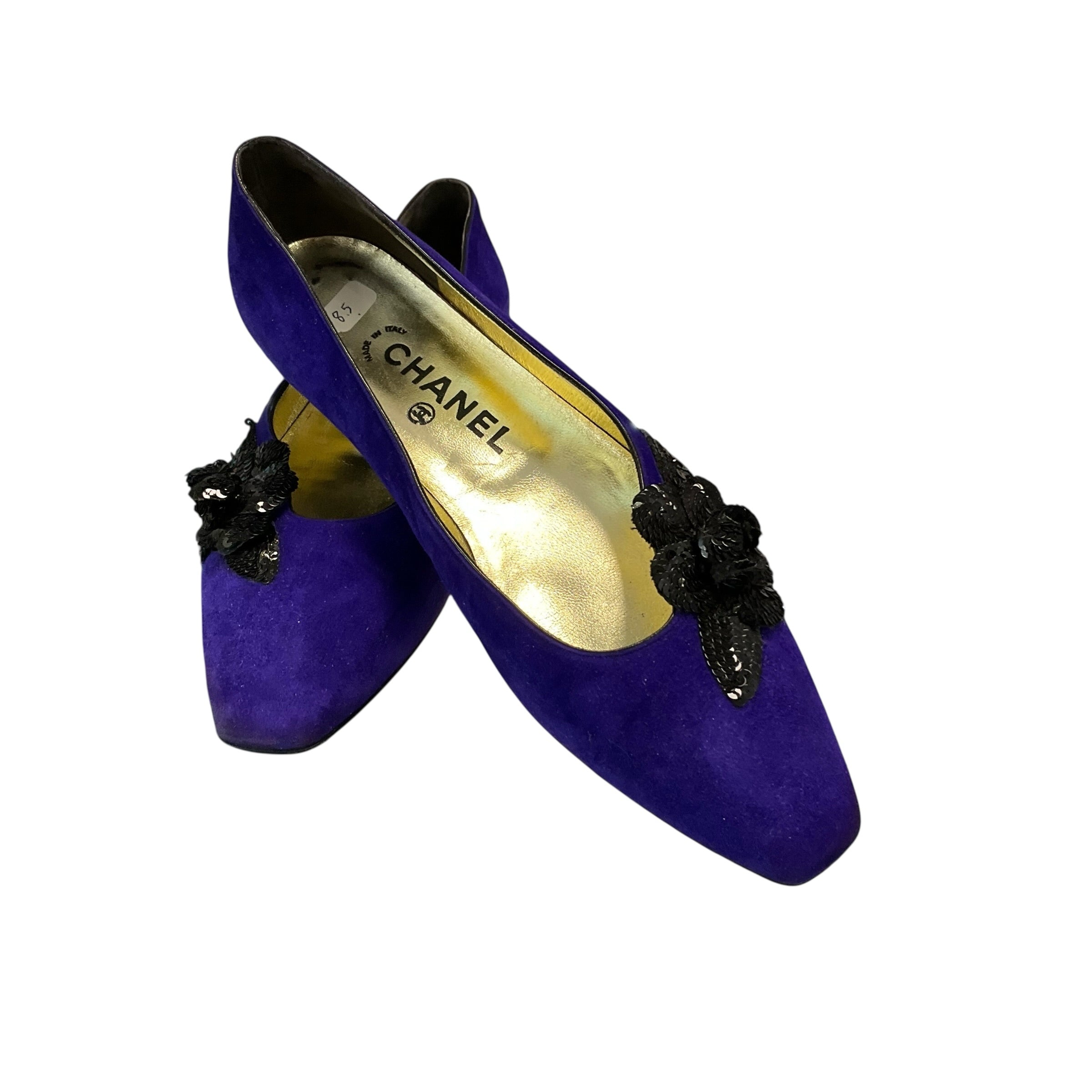 Authentic Chanel Purple Suede Pumps with Black Flower at Front and Box Size 8.5. CHIC AT THE BEACH Lewes Delaware.
